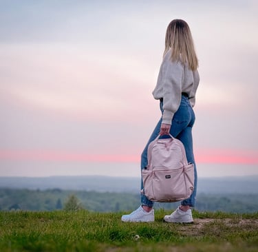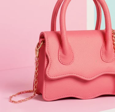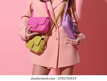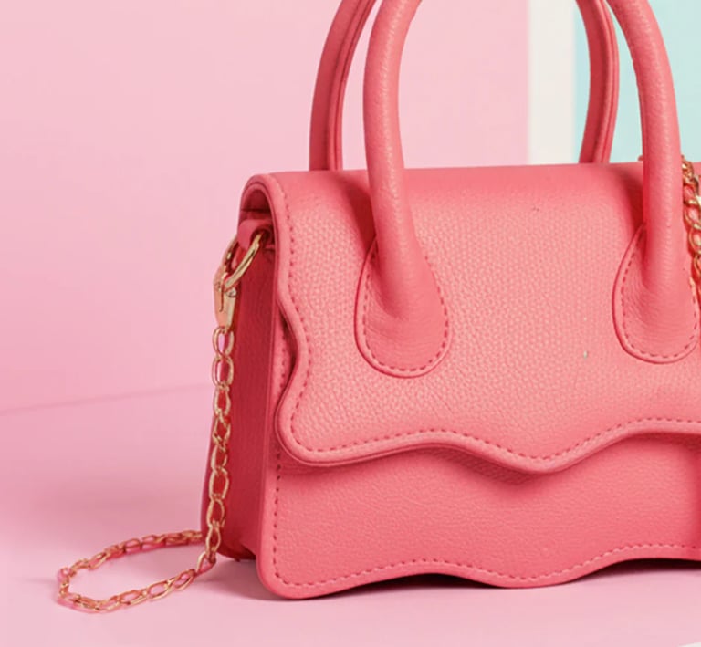 Handbags, shoulder bags, backpacks, and clutches in soft pastel pink hues.